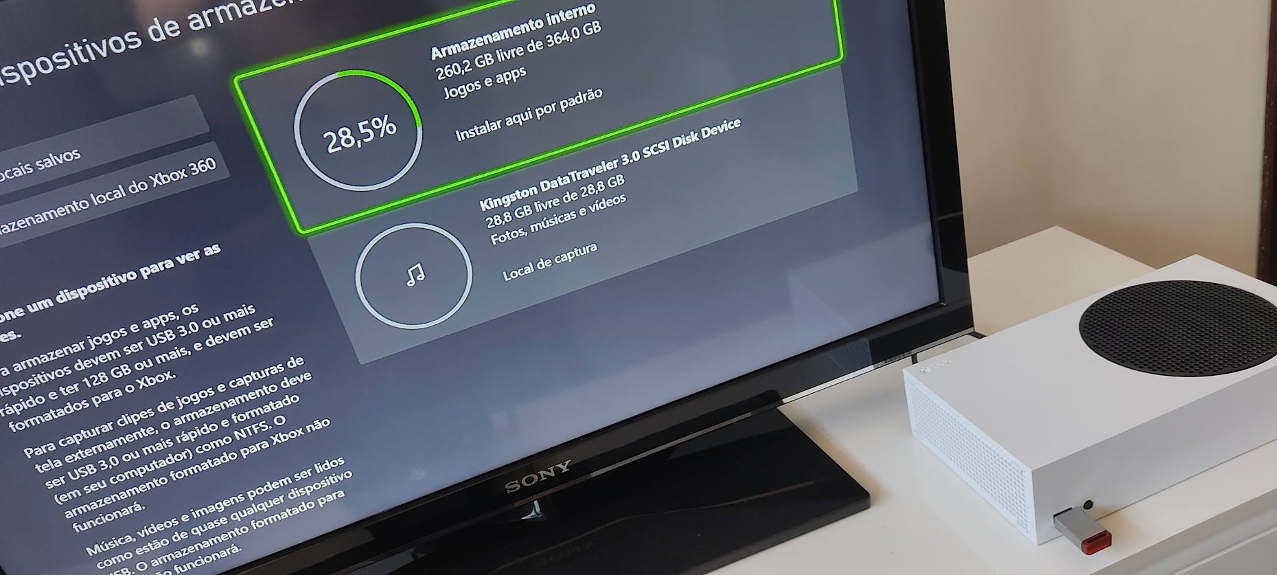 Não há como escapar deste ponto: 364 GB utilizáveis é insuficiente para quem joga muitos títulos diferentes. Em 2020, quando o console foi lançado, os jogos eram menores. Em 2026, instalações de 80–130 GB por jogo são comuns, e Call of Duty sozinho pode ocupar quase 200 GB.