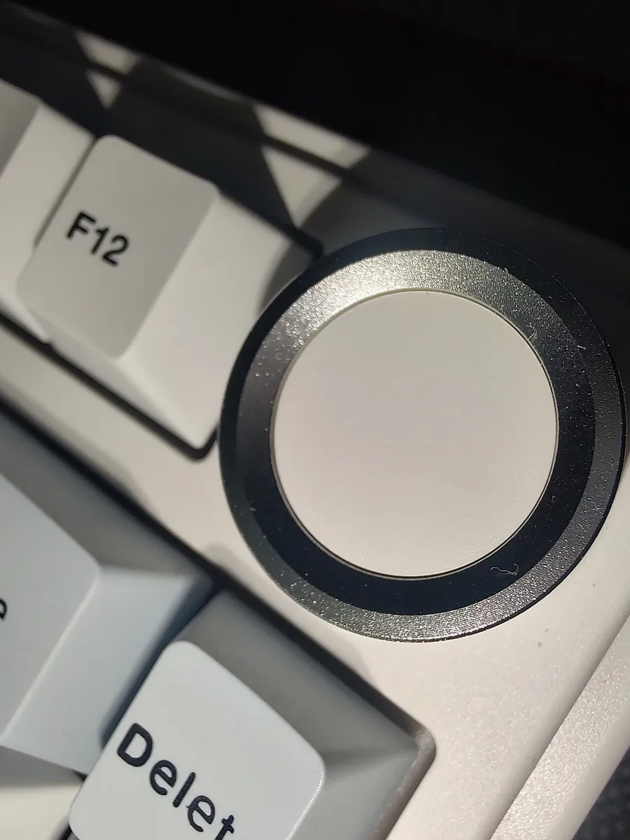 O teclado possui um knob (botão giratório) no canto superior direito, usado principalmente para controle de volume. É um detalhe de conforto que, uma vez que você experimenta, é difícil abrir mão.