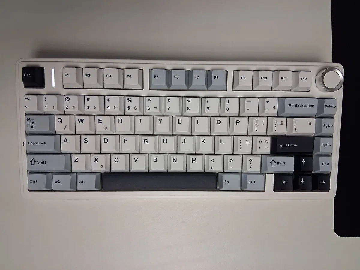 O layout 75% é um dos favoritos de quem quer economizar espaço na mesa sem abrir mão de teclas essenciais: as setas direcionais, a linha de F1 a F12 e as teclas de navegação estão todas presentes, comprimidas em um formato mais compacto que um teclado full-size convencional.